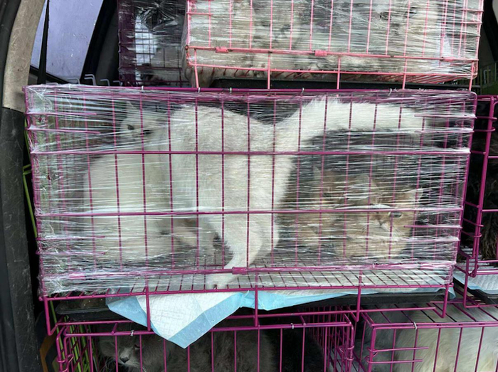 有销售商向第一财经记者展示了批发出货时的情况,一辆面包车上叠放着大大小小的笼子,装着十几只猫狗,非常拥挤,而一般销售是按笼销售,并非按只。