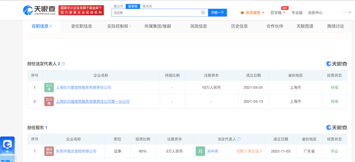 天眼查信息显示,玖只喵宠物服务有限责任公司成立于2021年,经营范围包括宠物服务(不含动物诊疗);宠物、宠物食品及宠物用品、日用百货的销售;互联网销售(除销售需要许可的商品)。玖只喵宠物服务有限责任公司虽然才成立两年不到,但有风险信息376条;法律诉讼74条,涉案总金额43.878466万元;涉诉关系71条,开庭公告52条,立案信息41条,多为“买卖合同纠纷”。该公司目前法定代表人为冯玉祥,公司由张黑手100%控股。此外,张黑手还担任了绿骏宠物用品商店的法定代表人。冯玉祥还持有东莞市福派宠物有限公司80%的股权。