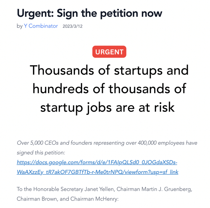 Garry Tan向美国财政部长珍妮特·耶伦和其他监管部门发布了一份请愿书 ,要求“缓解和关注对小企业、创业公司及其作为银行储户的员工的直接重大影响”,表示在硅谷银行存款的小企业应该得到补偿,同时,要求国会“恢复对地区银行更严格的监管和资本要求”。截至发稿日,已经有3500名CEO及创始人签署。