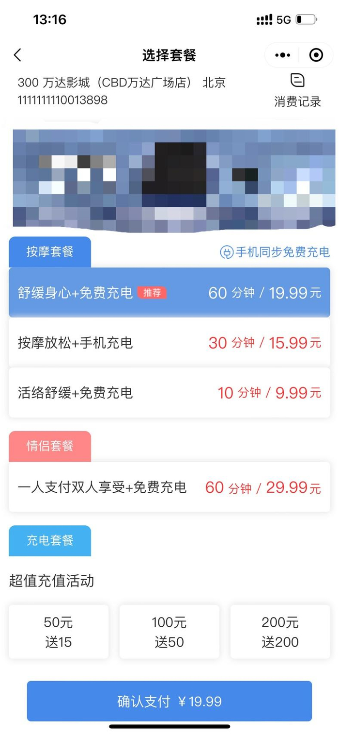 借此机会,记者也体验了一下这个按摩椅,整体感受座位的皮垫厚了很多,能明显感受到按摩仪器在后背的存在,对“坐”的体验来说确实是占用了一定的空间,需要挺直腰承受。更让人无法理解的是,在没有任何预兆的情况下,坐下两分钟后按摩椅突然自动启动,这大概是想让消费者免费体验几分钟的按摩,若是不知情的人,很有可能刚坐下,就会被突然的启动吓一跳。而两分钟的体验结束后,按摩服务停止,若是在观影时要继续享受按摩则要扫按摩椅上的二维码,在影厅关灯的幽暗环境下,若要扫码需要打开手机摄像头灯光(尽管有些二维码是夜光属性的,但亮度并不理想),扫码后进入页面则可以选择按摩套餐。以万达影城CBD店IMAX厅为例,微信扫码进入该按摩椅品牌页面,需要绑定用户信息,会有几个资费选择,例如19.99元可以购买“舒缓身心+免费充电”的功能,按摩将持续60分钟,甚至还有充电套餐的选择,也给观众提供了超值充值活动以引导观众持续使用按摩。