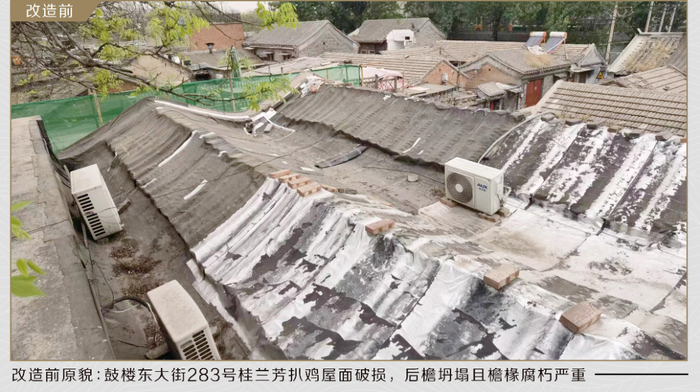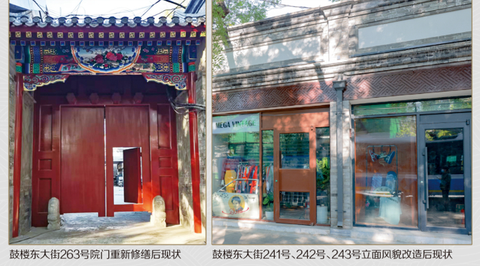 改造还针对重点建筑立面,参照原格局、原样式,采用传统工艺做法和材料,开展保护性修缮。由于年代久远,鼓楼东大街263号金柱大门木质结构腐朽,后檐木结构断裂,五架梁下垂,瓦面碎裂脱落。在修缮过程中,设计团队保留了原木门框和两侧抱鼓石,其余构件重新落架大修,采用了楦缝、砍斧迹、支浆等传统工艺,院门刷铁红色油饰,同时在门框部位增加苏式彩绘,尽可能恢复院门原来的风貌。