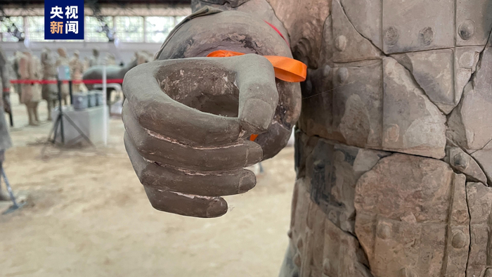 历经2200多年埋藏,兵器木柄早已腐坏,但兵俑紧握的手势未改,力量感依然十足。