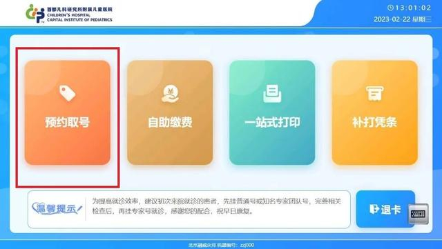 支持医保卡、医保电子凭证、京医通卡、公众号电子就诊码患儿在医院自助机或人工窗口取号。