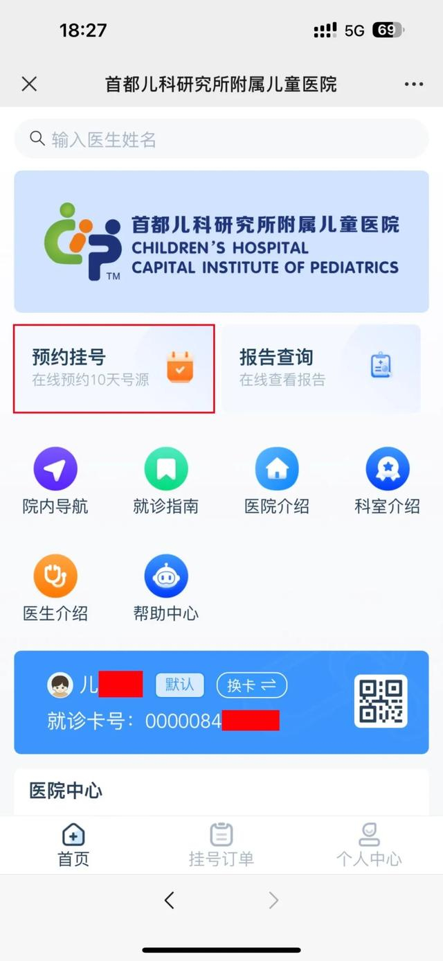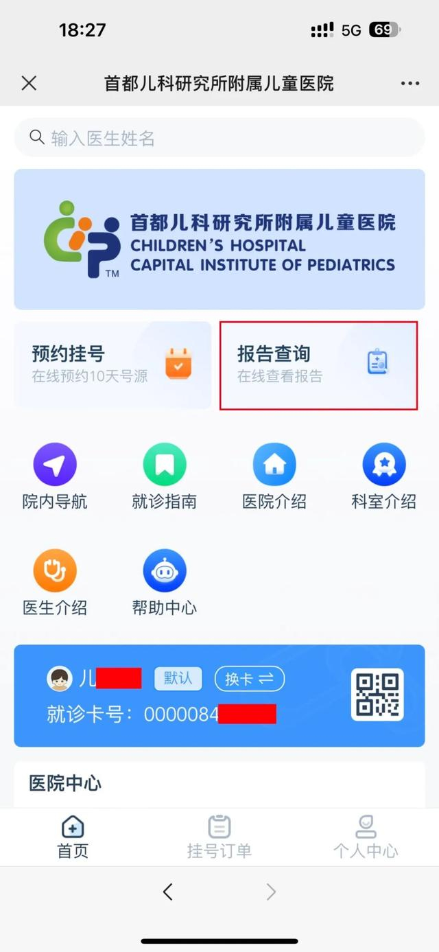 打开首都儿科研究所附属儿童医院公众号,首页点击“个人中心”进行注册登录。