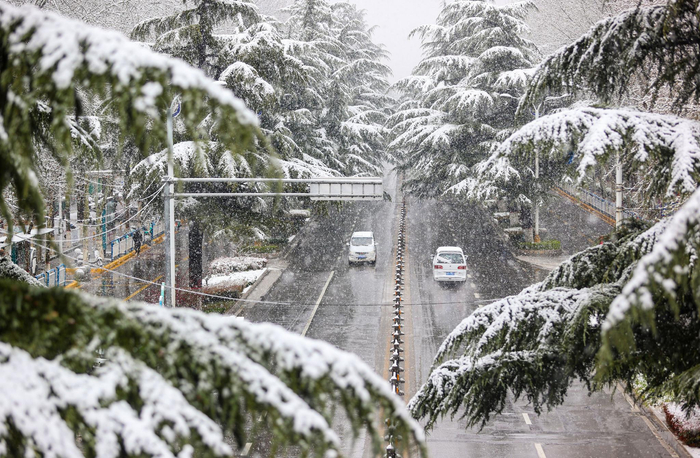 3月16日,河南三门峡,当地气温迎来“大跳水”,城区行道树积上了雪,车辆在雪中行驶。图/视觉中国