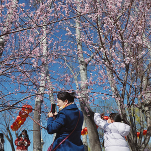 3月12日,北京玉渊潭公园,大风吹来蓝天,不少市民游客在山桃花下赏春。 新京报记者 薛珺 摄