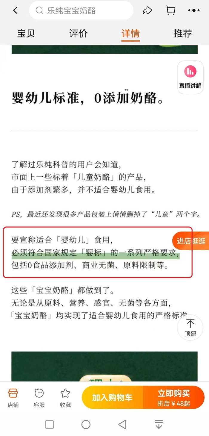 乐纯食品旗舰店出售的一款“宝宝奶酪”宣称符合国家“婴标”零食品添加剂要求,但实际标准并未要求零添加。目前宣传语已改。 电商截图