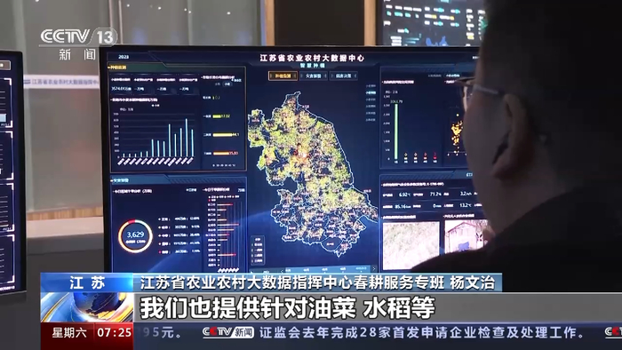 总台央视记者 蒋树林:江苏小麦播种常年在3500万亩左右,相当于320万个标准足球场的面积总和。要完成这么大面积麦田的苗情监测,我们的科研人员有了新的探索。我们来看,我身后就是江苏省农业农村大数据指挥中心,通过大屏幕,麦田田苗情一目了然。依托于国家级科技创新平台——南京国家农创中心,通过大数据分析,农田信息采集实现了全年不间断的远程操作。