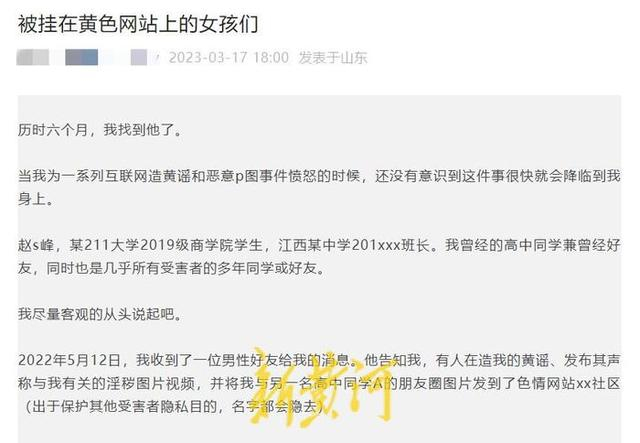 近日,一篇题为《被挂在黄色网站上的女孩们》的文章在网络上传播,引发关注。作者在文中称,某211大学一名男生系自己的高中同学兼曾经好友,这名男生多次将女性同学、好友发在朋友圈的照片,发到色情网站上,并恶意p图和造黄谣。