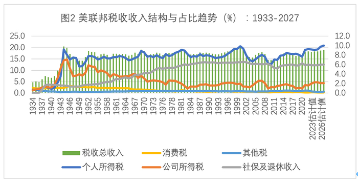 三是美联邦政府税收能力迅速下降的制度性因素和自身能力因素相辅相成。从美联邦财政史上观察,税收收入占GDP之比的长期趋势是不超过20%,二战后也只有在2000年达到过20%。在税收收入结构上,个人所得税和社保与退休收入占全部税收收入的3/4以上,公司所得税只占2%以下,消费税等其他税收收入占比微乎其微。但是考虑到社保与退休收入的暂扣属性(本质是政府负债),如果扣除这部分社会保障性收入,包括个人所得税、公司所得税等税收收入将只占GDP的13%左右,可见美联邦财政征收能力不高,不足以承担其全球治理的“基础性”和“支柱性”功能,而填补税收能力不足的手段选项,只能是依靠财政赤字并形成债务,而且负担会越来越重。