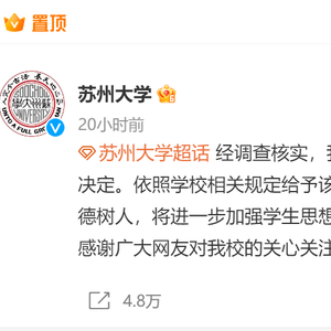 3月18日,苏州大学通报称,学校注意到舆情后高度重视,已于第一时间启动调查程序,后续将根据调查情况依法依规严肃处理。次日,苏州大学发布通报,称依照学校相关规定,给予赵某某开除学籍处分。学校高度重视立德树人,将进一步加强学生思想品德和法治教育,切实维护学校健康向上的育人环境。