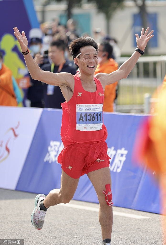 何杰以2小时13分29秒的成绩在深圳马拉松夺冠。