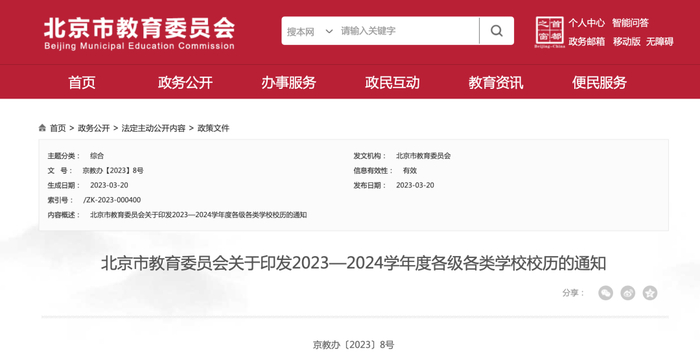 北京市教育委员会今日发布《关于印发2023—2024学年度各级各类学校校历的通知》,一起来看看吧~
