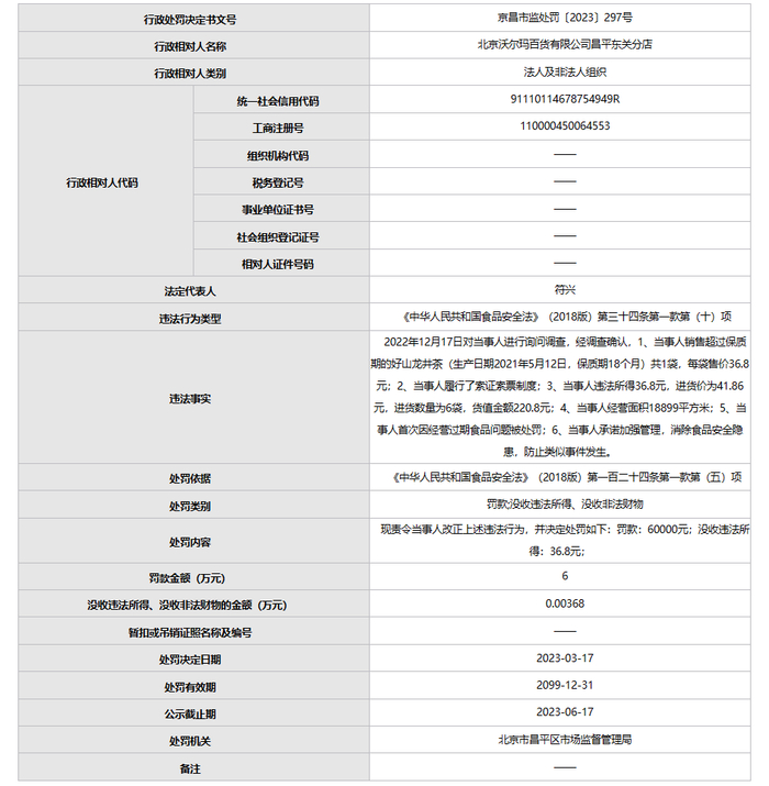 新京报讯 近日,北京市市场监督管理局在其官网公示了对北京沃尔玛百货有限公司昌平东关分店的处罚决定。处罚决定书显示,该门店因销售超过保质期的好山龙井茶,被北京市昌平区市场监督管理局罚款60000元,并没收违法所得36.8元。行政处罚决定书详情如下: