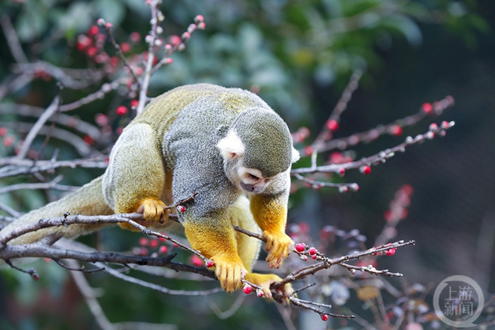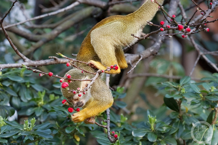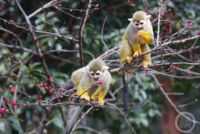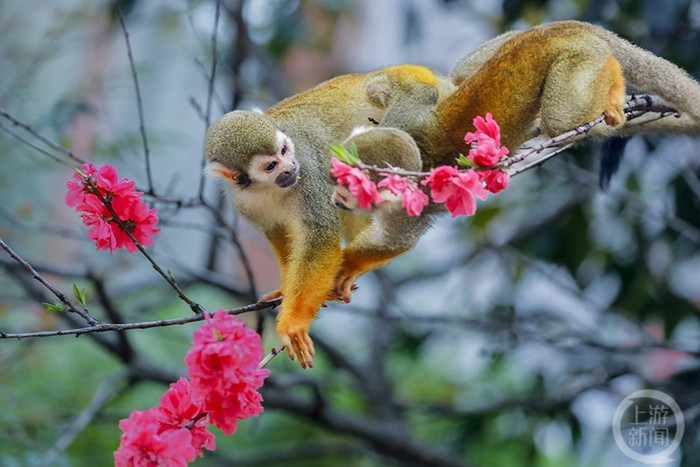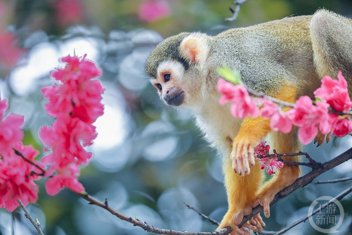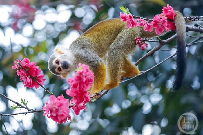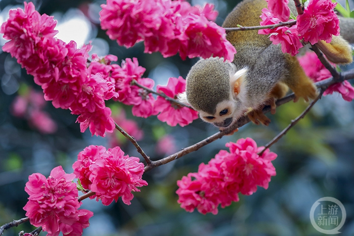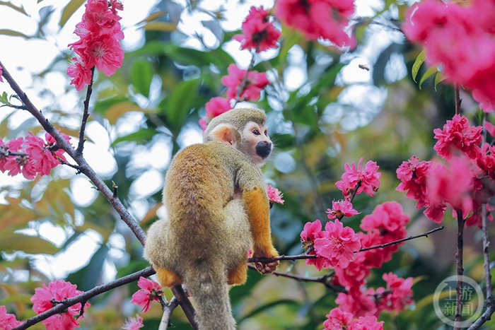 三月春暖,赏花正当时。重庆乐和乐都主题乐园内的碧桃花竞相绽放,松鼠猴爬上树梢悠闲地赏花、摘花、闻花、尝花,宛如花间精灵,活泼可爱。