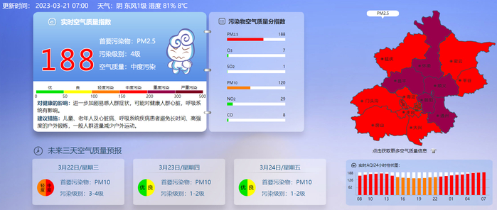 新京报快讯 据北京市生态环境监测中心官网消息,截至21日7时,北京市空气质量指数为188,污染级别为4级,已达中度污染标准。