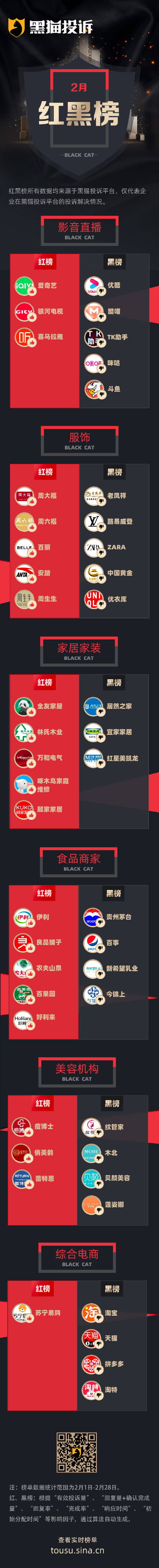 黑猫投诉发布2月份企业投诉处理红黑榜单,数据均来源于黑猫投诉平台,反映了企业在黑猫投诉平台的投诉处理解决情况。