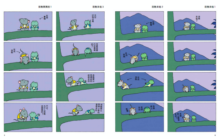 “爱思考的青蛙”系列是绘本大家岩村和朗创作的故事绘本,作者使用了四格漫画的形式,书中的小青蛙和朋友不断提问并尝试解答。在《爱思考的青蛙——夜晚从哪里来?》中,小青蛙在和小老鼠看过夕阳后,开始认真思考各种关于“夜晚”和“睡梦”的问题。“夜晚是从哪里来的?”小青蛙问,“从树根、从小草?”“夜晚为什么会黑黑的?”“是夕阳把白天带走了。”“小老鼠,你昨晚做梦了吗?”青蛙问。“有,做了尿尿的梦。”“是怎样的尿尿梦呢?”“那青蛙的梦呢?”“是飞上天空的梦。”……