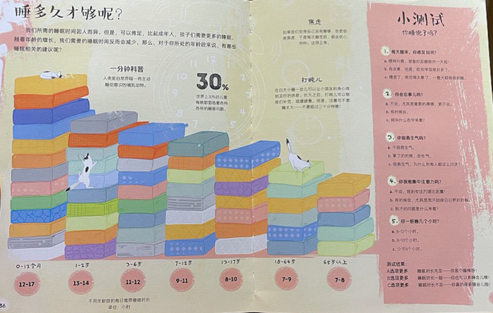 这是一本DK给孩子们写的睡眠知识小百科。全书用一只喜欢睡觉的猫咪做引导,从各个角度讲述关于睡觉的小事儿。全书提供交叉学科的知识——历史、地理、动植物、生物、人体、心理和社会研究。让孩子了解睡眠的阶段有几个、我们为什么会做梦、噩梦是怎么来的、跟睡眠相关的历史和神话传说有哪些、不同时期的床有什么特点、大自然其他生物的睡眠特点、如何拥有优质睡眠……