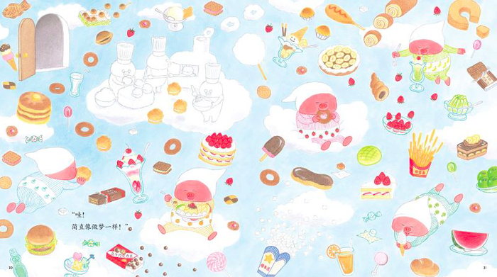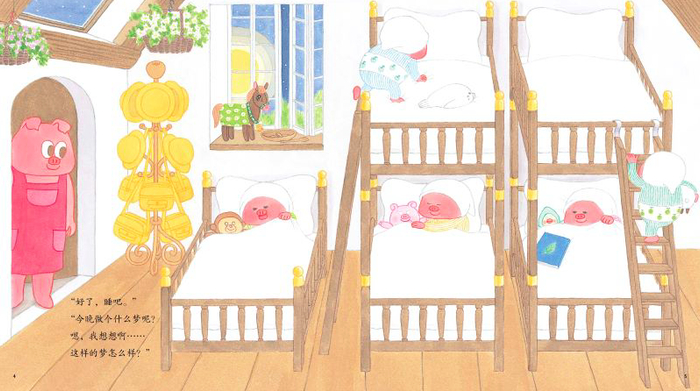 这是工藤纪子创作的关于睡梦的绘本。睡觉时间到了,小猪们换好睡衣、洗脸刷牙,上床开始讨论“今晚做个什么梦”。五只小猪接连表达了自己期待的梦境,居然聊到了天亮。他们出门发现自己在天上被各种美味甜品包围。爸爸妈妈来到卧室,看到小猪们已经睡得香甜。原来,小猪们不知不觉已经进入梦境了。