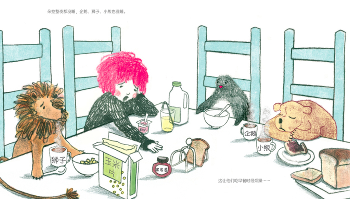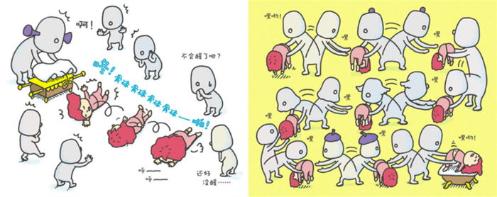 成为照顾者的小男孩肉眼可见地因为缺乏睡眠变憔悴了,阅读绘本的孩子又是否能在荒诞的幽默中体会到父母的心情呢?