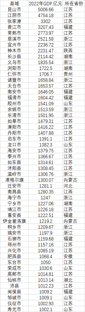 52个GDP千亿县中,十强分别是昆山、江阴、张家港、晋江、常熟、慈溪、宜兴、神木、长沙县和义乌。其中,领跑者昆山2022年全年完成地区生产总值5006.7亿元,按不变价格计算同比增长1.8%,成为全国首个GDP突破5000亿元的县域。若将昆山与地级以上市比较, 昆山GDP总量超越了贵阳、兰州等8个省会城市,GDP约位居第57位。
