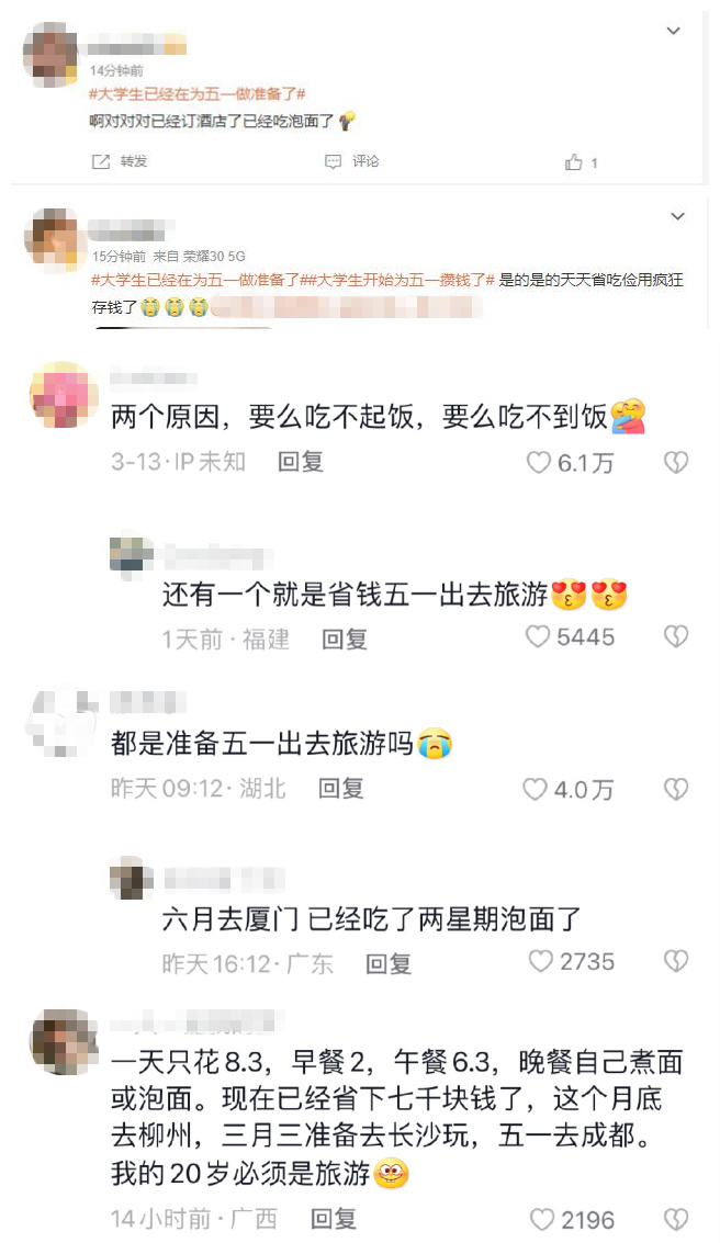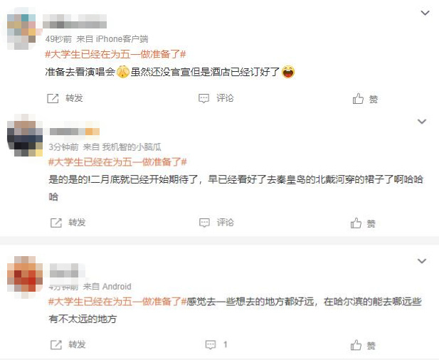 #大学生已经在为五一做准备了#,21日,这个话题登上多个热搜。话题下面,网友们尽情畅聊,关于五一的出游计划。