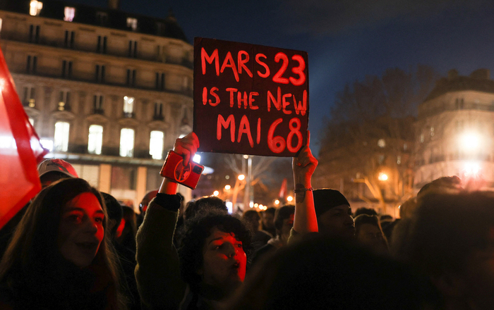 由此,眼下同时摆在宪法委员会案头的退休改革法案和RIP公投程序,隐然形成了一场赛跑。如果前者抢先生效,便可以用宪法规定的一年期限来自我保护;马克龙3月22日接受采访时强调,将在年底之前将退休改革付诸实施,也隐含着这一层考虑。但从目前汹涌的社会情绪来看,一年保护期届满后,退休改革法恐怕仍然要面对RIP公投的挑战。