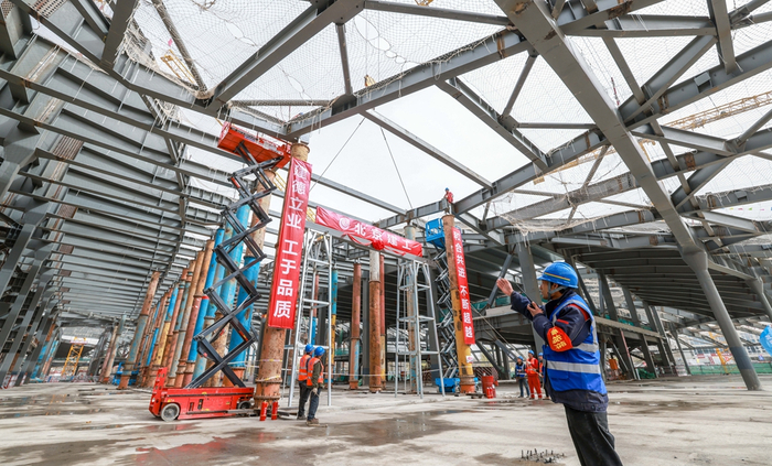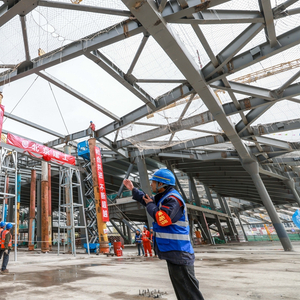 3月22日,在中关村论坛永久会址工程施工现场,最后一根结构钢梁稳稳升空,吊装就位,标志着钢结构全面封顶,“三叶草”造型的基础骨架正式成型。这座备受关注的首都“科技会客厅”预计于今年8月底整体交竣。