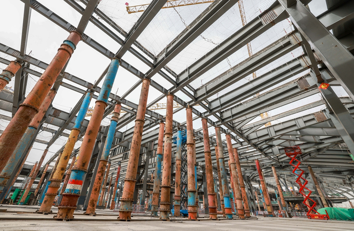 走进施工现场,主报告厅的最大跨度达到47.6米,悬挑21米,极具视觉冲击力。“由于限高和使用空间要求,我们决定使用多排的单根‘工’字钢作为屋面钢结构,减少屋面占用室内空间。”张帅介绍,项目采用钢筋混凝土组合梁的形式制作了一个特殊的“屋顶”,依靠混凝土的抗压性来承载未来屋面上的绿化重量,同时借助钢结构抗拉性强的特点托起混凝土,将屋面整体的重量通过两侧立柱进行分散,打造出坚固的体系。