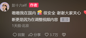 ↑23日,记者在查看“彭十六elf”的账号主页时发现,3月5日的视频下方已更新置顶了原作者留言,即“人在国内,断更是因为在调整视频内容”。