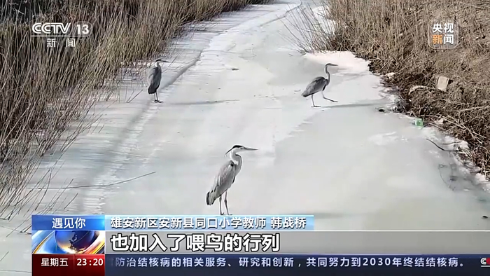 雄安新区安新县同口小学教师 韩战桥:把鱼都撒在冰面上边,它们都在远处等着,等人离开之后,有一只鸟会过来先探探,觉着安全,然后其它的鸟也都过来了。