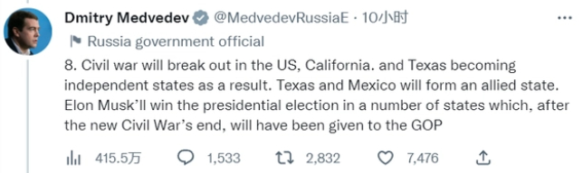 去年12月26日,梅德韦杰夫晒出了自己对2023年“最疯狂、最荒谬”的十大预测,其中包括“美国爆发内战”、“加利福尼亚州和得克萨斯州将独立建国”、“得克萨斯将与墨西哥结成盟国”以及“埃隆·马斯克将成为美国总统”等。