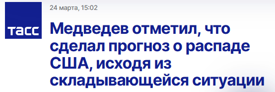 24日,俄联邦安全会议副主席梅德韦杰夫在采访中被问及此事,他先旧事重提,说起去年年底自己曾脑洞大开做出的“2023年新年预测”,“你知道,去年年底有位分析师预测说美国将在2023年解体,他的名字是梅德韦杰夫。尽管这只是开玩笑,但我当时是根据美国国情做出的预测。”