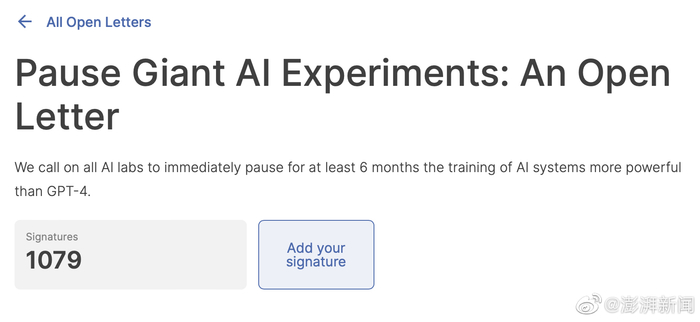 [#马斯克等千名科技人士发公开信#:#呼吁暂停训练比GPT4更强大的AI系统#]29日,未来生命研究所公布一封公开信,呼吁所有AI实验室立即暂停训练比GPT-4更强大的AI系统至少6个月。截至发稿,这封信已有1079名科技领袖和研究人员签名,除了马斯克、辛顿和马库斯之外,还包括图灵奖得主约书亚·本希奥、《人工智能:现代方法》作者斯图尔特·罗素、 苹果公司联合创始人史蒂夫·沃兹尼亚克、Stability AI首席执行官埃马德·莫斯塔克等科技界领袖人物。