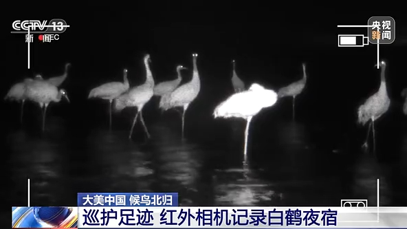 全世界95%以上的国家一级保护动物白鹤,都会在鄱阳湖越冬。目前,这些白鹤已经分批从鄱阳湖出发北归。由于白鹤习惯于白天在一个地方觅食,夜间则在另一个地方休息,极少有人能拍到它夜宿的影像。白鹤夜宿时是什么样的状态?观鸟爱好者的红外相机,为我们揭晓了答案。