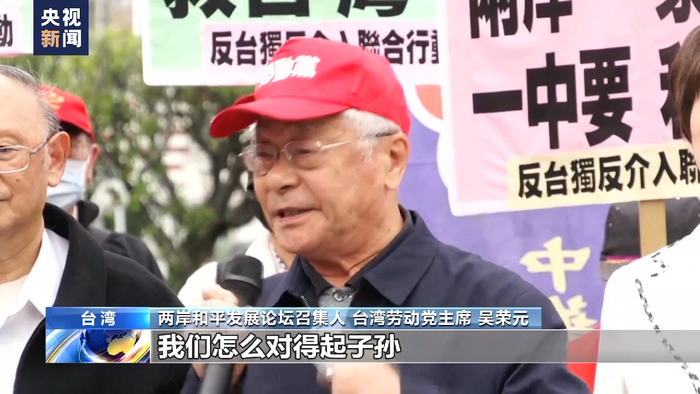 两岸和平发展论坛召集人 台湾劳动党主席 吴荣元:我们的子子孙孙,怎么可能让他们葬送在美国这样的战争贩子手中。大家知道今天美国的“毁台”计划一波一波,已经把全台湾推向战争的悬崖边缘。我们再不自救,我们怎么对得起子孙,怎么对得起台湾社会好几代前辈们共同建设的家园。