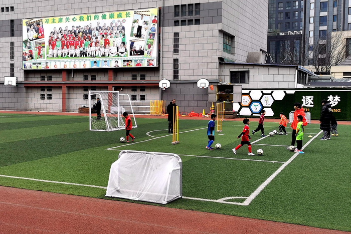 依靠分组轮转的上课形式以及高效的场地利用,“万小”在一块八人制场地上满足了每周全校一千多学生上一次足球课,十余支队伍进行“四练一赛”的使用需求。