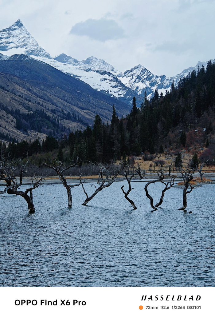 Find X6 Pro在色彩的还原表现上也让我印象深刻,虽说四姑娘山并没有太丰富的大块色彩,但是不同的山峰之间、树木和枯林之间,还是存在很丰富的色彩变化的,而Find X6 Pro的长焦镜头几乎都毫无保留的捕捉到不同色彩之间的细微区别,很多情况下甚至不需要后期做处理就可以使用。