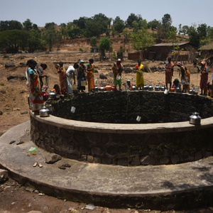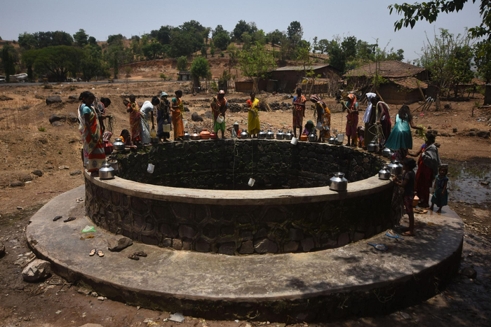 当地时间2022年5月15日,印度孟买,受到气温上升的影响,当地许多村庄多年来面临的缺水问题情况恶化,村民聚集在一口干涸的井周围用油罐车打水。图/视觉中国