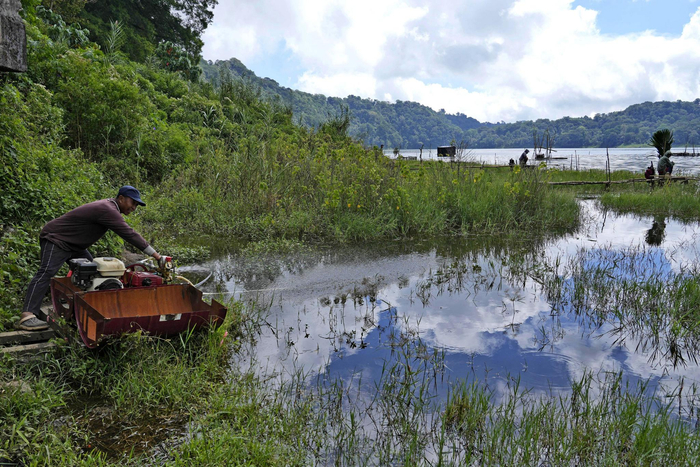 当地时间2022年4月16日,印度尼西亚巴厘岛,一名男子在湖边取水。在不到十年的时间里,巴厘岛一些地区的地下水位下降了50多米,引发人们对水源危机恶化的担忧。图/视觉中国