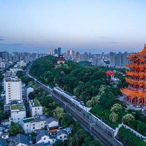 高居蛇山之巅的黄鹤楼,建筑具有独特的民族风格,京广铁路的列车从楼下呼啸而过,远远望去,楼如黄鹤,展翅欲飞。