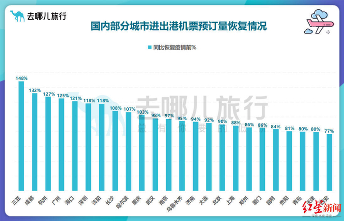 红星新闻记者了解到,2023年夏秋航季从3月26日正式开启,《2023年夏航季航班时刻配置政策》显示,国内客运周计划航班量已超过疫情前(2019年)。旅游平台数据显示,2023年3月以来,国内多个城市机票预订量已恢复至疫情前水平。3月预订量前25名的城市中,三亚、成都、杭州、广州、沈阳、海口、哈尔滨、长沙、重庆进出港预订量已超过2019年。