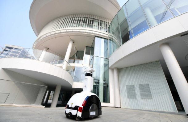 雄安中交未来科创城“未来源点”,一台自动扫地机器人正在进行清扫工作。