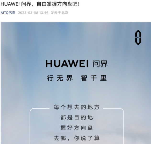 此前,问界系列汽车的品牌中仅出现“AITO”“问界”的标识,不过,今年3月8日,华为生态汽车品牌正式焕新为HUAWEI问界,AITO汽车在微博、微信等多个平台的宣发中,首次使用了“HUAWEI问界”的全新标语。从此之后,几乎所有华为线下门店的AITO汽车车身都贴上了“HUAWEI问界”的logo,线下渠道也在销售时将此作为重点宣传话术,以突出华为。