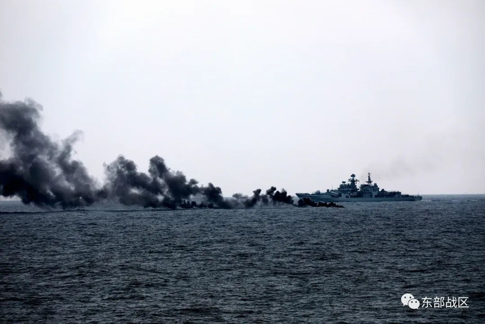 面对复杂多变的“敌”情态势,编队指挥员沉着冷静,综合分析战场态势,指挥编队各舰进行烟幕释放,各舰利用烟幕快速机动,占据有利阵位对“敌”舰进行火力打击。