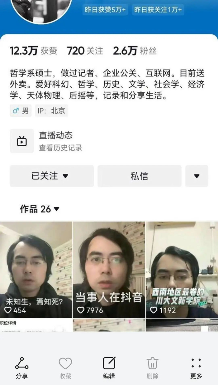 他是网友们关注的38岁的失业川大哲学硕士,在视频中自述“投出上百份简历被拒”“应聘出家道士不符年龄”,在接受媒体采访时,表示“送外卖比写公关稿轻松”,也曾泪洒直播间,发问“不知道自己哪一步走错了”。