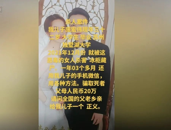 可是谁都没有怀疑在庞家人面前一向沉默的查丽。2022年2月24日,庞家父母到苏州虎丘区派出所报案,对方建议他们到庞伟居住的辖区派出所反映情况,在沧浪区友新派出所,他们得到消息,儿媳已经在前一天来所里报案,说“你儿子投资失败,到外地务工了”。