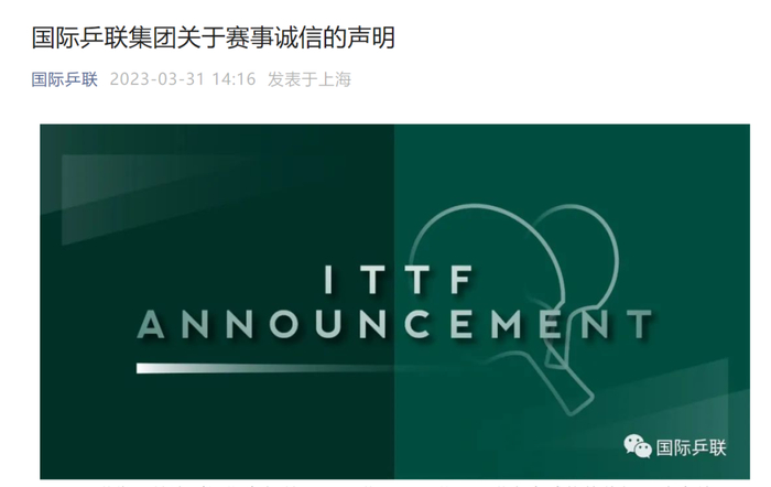 对此,3月31日,据WTT世界乒乓球职业大联盟消息,国际乒联集团关注到近期有关国际乒联、WTT世界乒联赛事诚信的传闻,特发表如下声明: