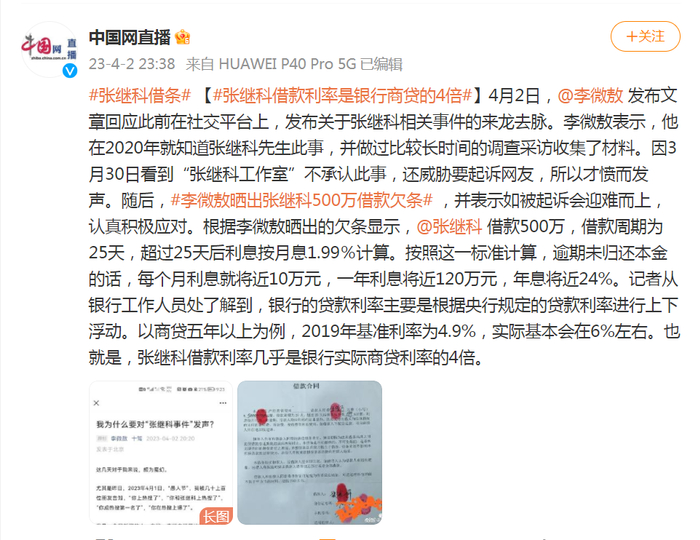 2日晚,媒体人李微敖在微信发长文回应此事,并晒出据称为张继科签字的500万元借款合同。
